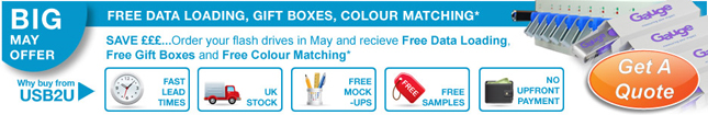 Don’t order your custom USB flash drives until you’ve checked out the latest promotional offers from USB2U. During May 2011 we’re giving away a free gift box with every USB flash drive ordered and load up to 100MB of data absolutely free of charge as well!
