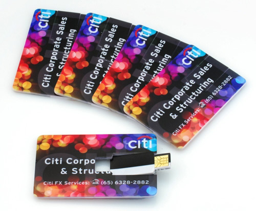USB credit cards have also been seized upon by the promotional gift sector where sales are rocketing. Sales have been fuelled by several factors including the ability to print larger, more complex and more vibrant full colour prints on the cards and the immediate acceptance of the product by the consumers who can immediately find a “home” for the card in their wallet or purse.