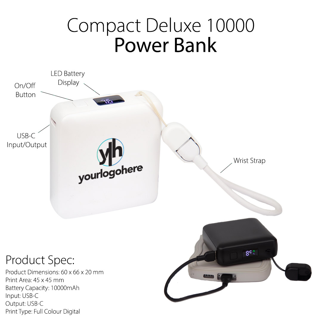 Fast charge devices with our latest 10000mAh Power Bank. The Compact Deluxe 10000 is a compact, long-lasting power bank that offers a large branding area, an LED battery display and a high-speed USB-C to USB-C cable attached that doubles up as a wrist strap.