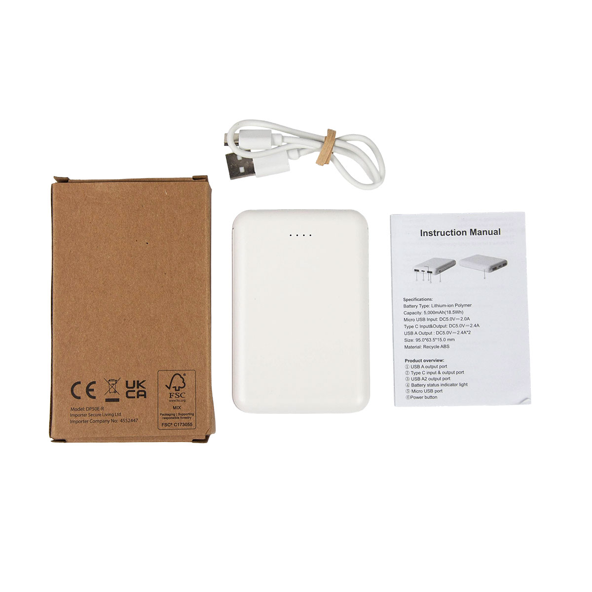 The casing is made of recycled ABS plastic, and has two USB ports to charge two devices simultaneously, and has both micro USB and Type C input to charge the power bank. Now with USB-C output!