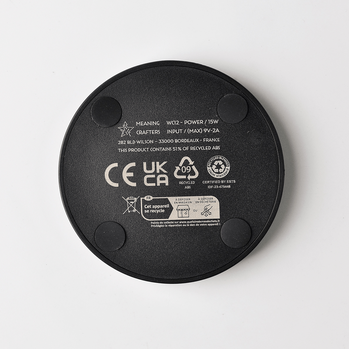 A 15W wireless charger with an illuminated logo. Made from recycled ABS plastic certified to the RCS (Recycled Claim Standard). Comes with a manual and a TPE Type-C cable. From the Meaning Crafters range of products.