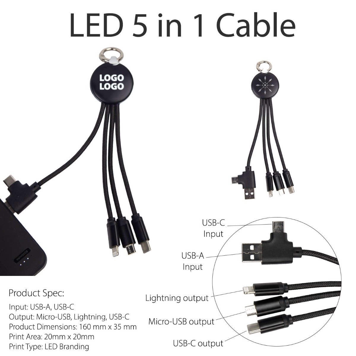 The LED 5 in 1 Cable is a multi cable that is branded with an LED light-up logo on one side of the round face. Available in an all black finish, the LED 5 in 1 Cable is a sophisticated multi-cable that makes a fantastic promotional gift.