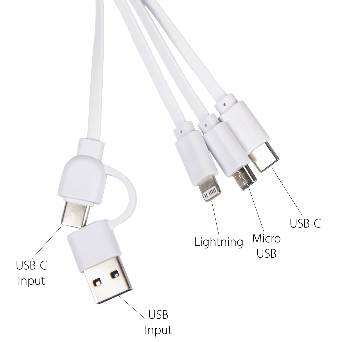 The Promotional 5-in-1 Charging Cable is a brandable multi-cable available in clean white or black colours, allowing for connection to a wide variety of devices. Featuring both USB-C and USB-A inputs, as well as three different output connectors: USB-C, Lightning and Micro-USB, the Promotional 5 in 1 Charging Cable allows for connection to all modern smartphones as well as tablets and more.