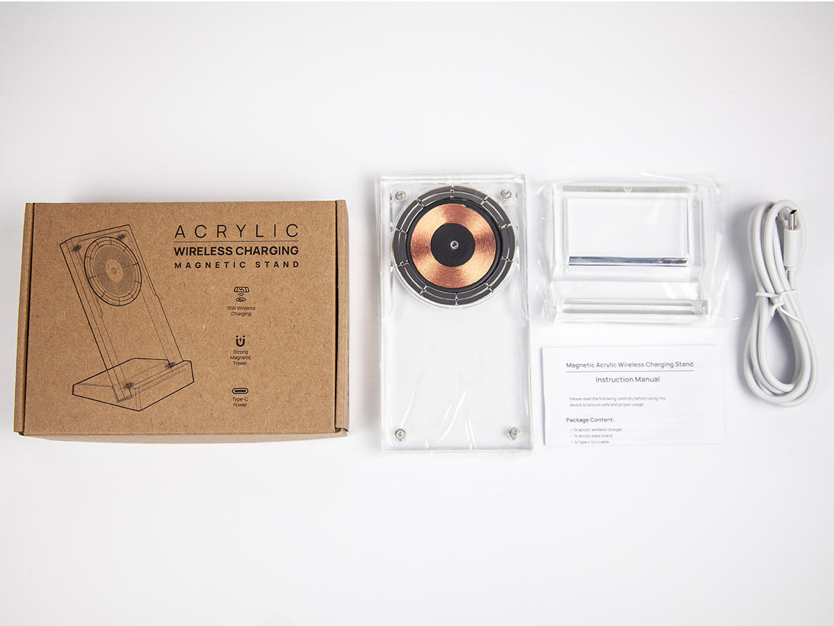 Made from crystal-clear acrylic, the Transparent Wireless Charging stand allows you to see the copper charging coil, while a blue LED light acts as a charging indicator when your device is charging.