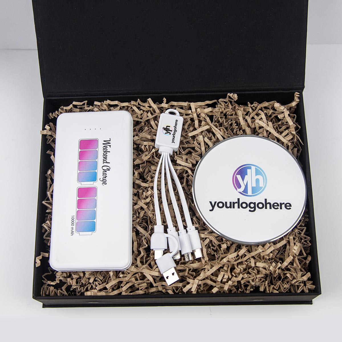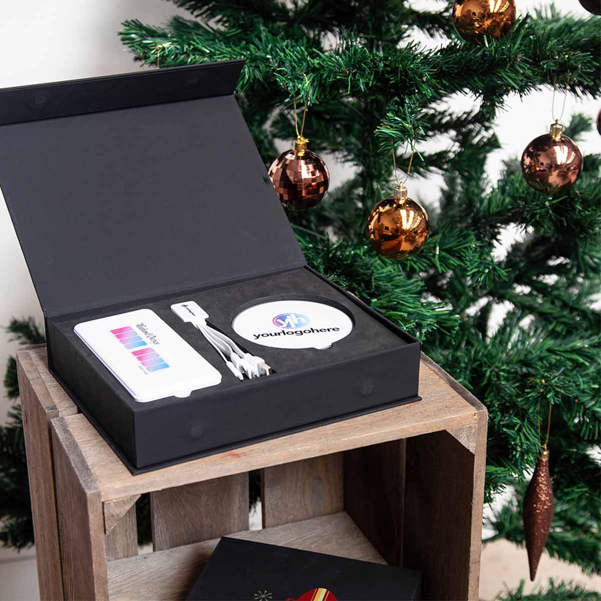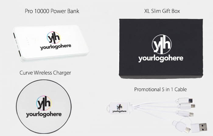 Perfect for corporate events, both the presentation box itself and each charging product can be printed with a company logo in full-colour digital print, allowing for a bold and seamless end result.